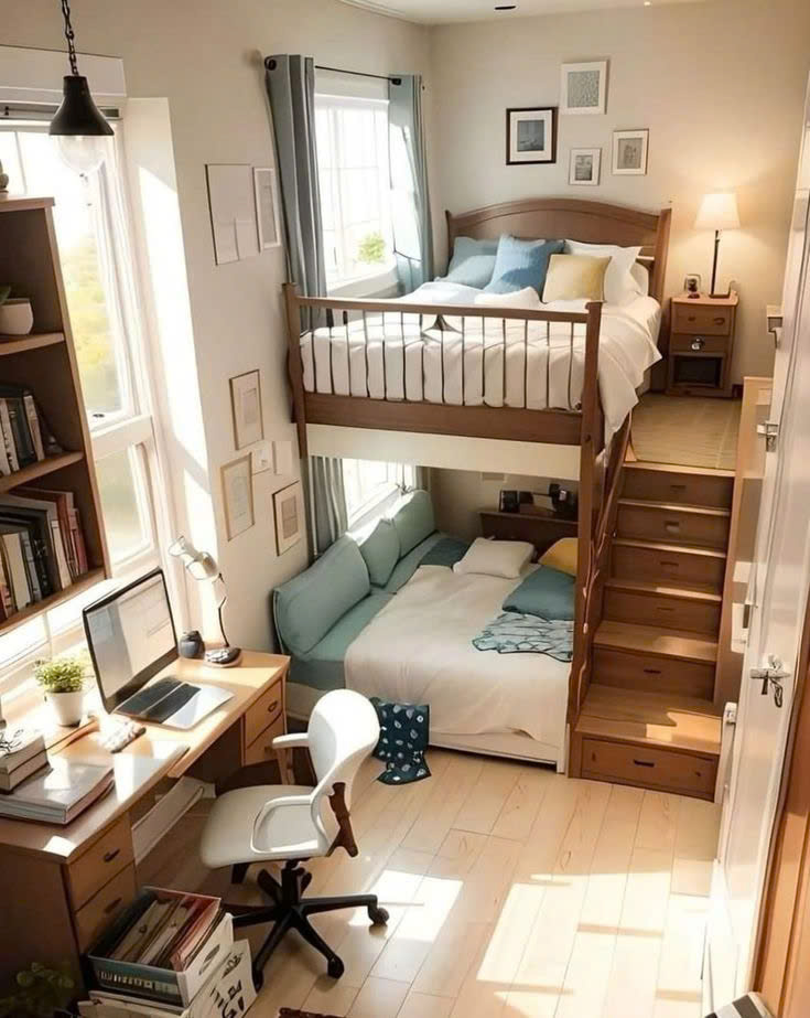 - Giường tầng dạng loft: Thiết kế tầng trên để ngủ, tầng dưới để bố trí bàn làm việc hoặc ghế sofa, tạo không gian sống linh hoạt.